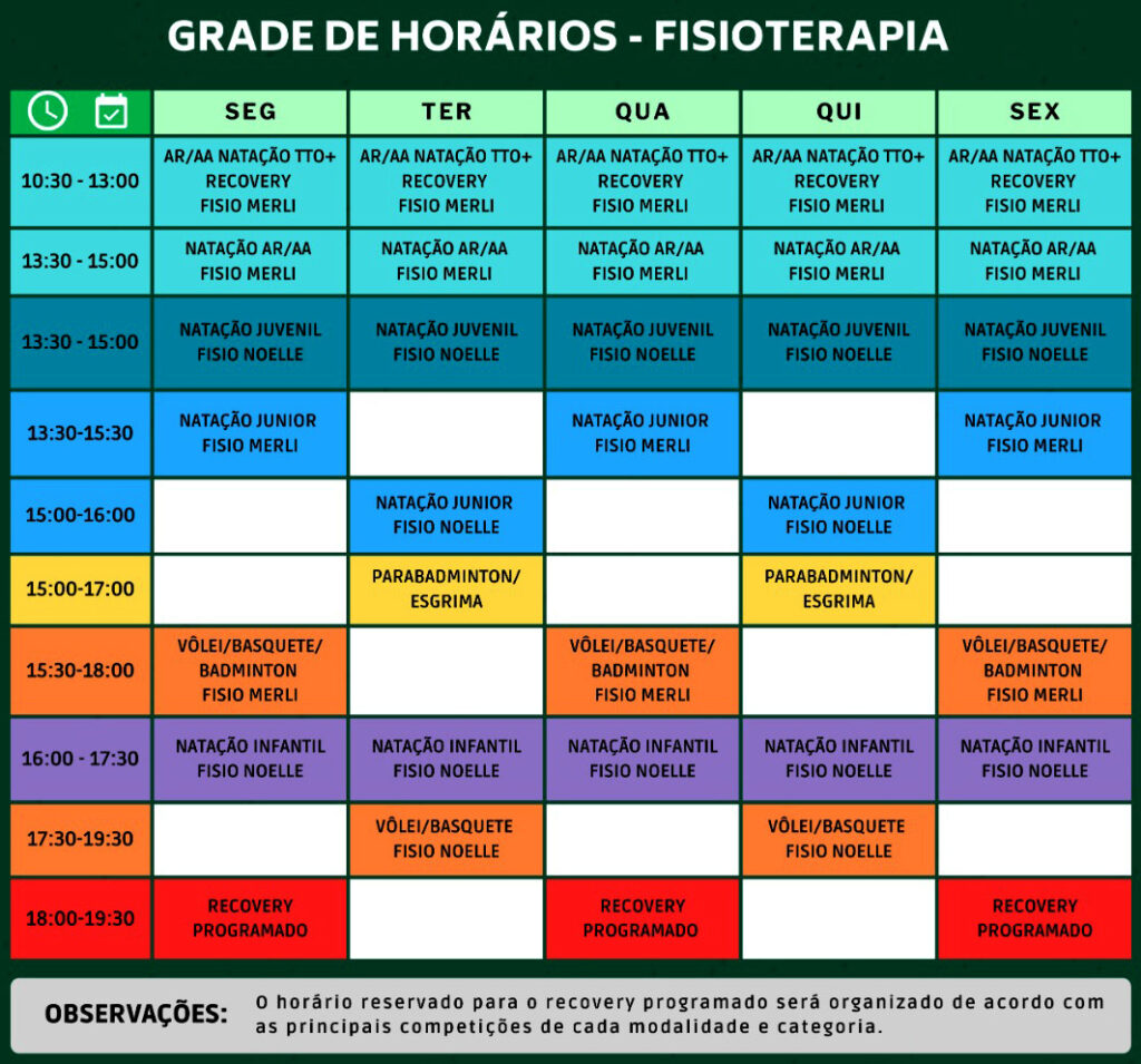 Fique atento ao horário da sua categoria e, em caso de dúvidas, procure o fisioterapeuta responsável ou a comissão técnica.