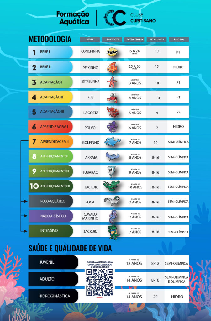 - Foca e Cavalo Marinho: turmas que vivenciam os fundamentos de outras modalidades aquáticas.